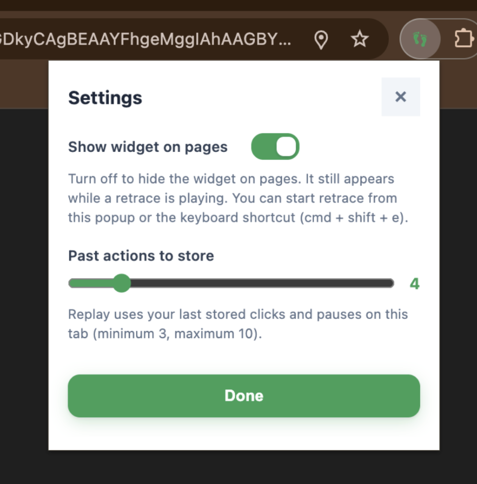 Multiple ways to start and stop retrace including button in extension popup, keyboard shortcut, and widget. Widget that users can press on to start retrace, and press again to stop the retrace. The widget can be dragged anywhere on the screen.