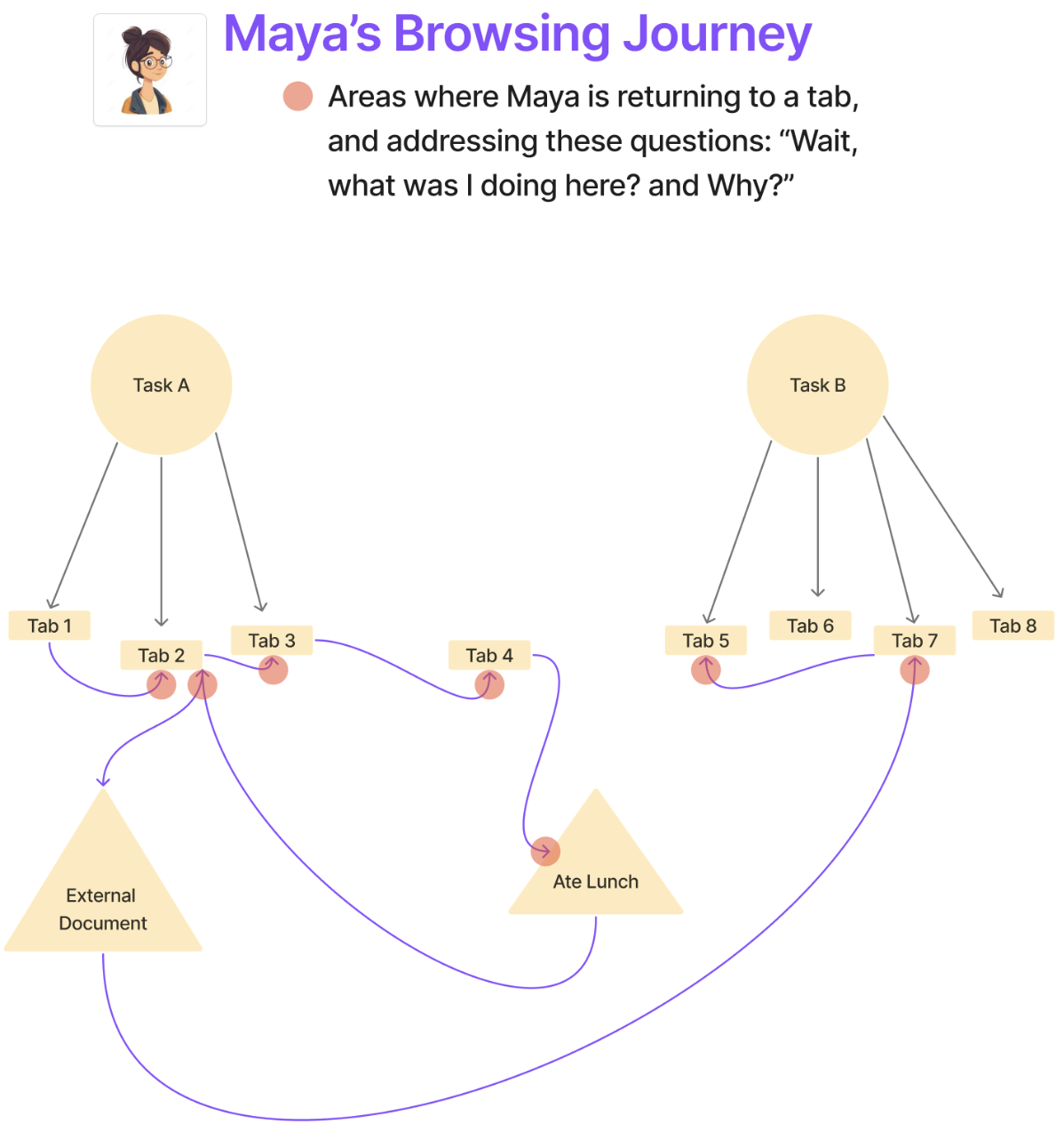 Users rely on context clues such as content on page, tab groups, or external note-taking to understand what they were doing, why, and how to move forward.